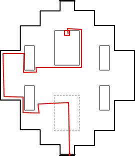 【落とし穴を回避しながら抜ける道のり】 階段の建物沿いに右回りで下へ ⇒建物より一歩下に来たら、そのまま左の柱に向かってまっすぐ左に進んでいく。 ⇒左の柱に突き当ったら、その柱にピッタリ沿うようにして左周りに周り、柱の左側へ(柱は2マス分あるが、上のマスで止まること!) ⇒柱の左側に来たら、今度は左側にある壁にそって左へ歩く。突き当ったら下へ、さらに突き当ったら右へ。 ⇒左下の柱に突き当るので、またも柱にぴったりと沿うようにして今度は右回りに回って柱の右側へ行く(柱は縦に2マス分あるが、下のマスで止まること!)。 ⇒右側に来たらそのまま中央までまっすぐ右へと歩いていく。 ⇒中央まで来たらそのまま真下へまっすぐ降りる。 |