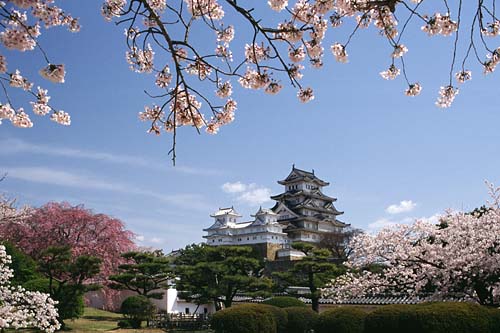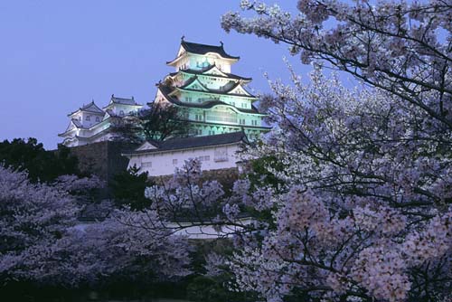 姫路城にライトが感じられて、桜に太陽の光線が微かに残っている瞬間に撮影しました。