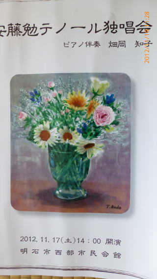 明石第九合唱団で一緒に歌っている安藤勉さんのテノール独唱会が明石西部市民会館ホールで開かれ、聴きに行きました。退職された66歳から先生について声楽を学ばれたそうですが、島根大学名誉教授の森山氏から森山式発声法を学んで以来、高音が楽に出るようになり、声域が広がったそうです。
