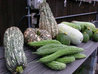 朝から「台風が近畿にも接近するおそれがあり、今日午後から強い雨が降るかもしれない」と放送していました。昨年この時期の台風で、畑や庭の菜園がすっかり駄目になってしまったので、午前の「明石公園の自然を楽しむ会」を欠席し、畑の収穫をしました。といっても畑の瓜類(なんきんやトウガン)と庭のゴーヤです。今年は奇妙ななんきんが沢山なったのですが、味の方はいまいちだったので、この様な実が畑に残って落ち生えになったらいけないと思い、ツルをすっかり抜き実を全部回収しました。ヘチマのような形のナンキンは大きい方が4s、丸い方が3s、トウガンも大きいのが3s、ゴーヤは7本合わせて2sありました。二人でどれだけ食べられるかちょっと心配です。ゴーヤが赤く実ったところが見たいという人がいるので、40センチ以上の大きな実を1本残してあります。折角色づき始めたのに台風で大丈夫なのか、こちらも心配しています。
