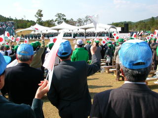 9時50分から始まったウエルカムアトラクションやプロローグに続いて、式典が始まる11時には皇太子殿下が到着、着席されました。フラッシュさえ使わなければ座ったままだと写真撮影は自由で、初めて自分のカメラで皇太子を写しました。ただし、遙か遠いところだったので、私の小さなカメラでは、小さく写っただけでした。式典後配られた弁当には材料の産地(県下各市町)まで書かれた「おしながき」が入っており、さすがに全国大会だと思いました。ペットボトルのお茶も母子茶を使った地元三田産でした。食後、会場となった県立有馬冨士公園の斜面に「紫式部」などの植樹をしました。移植ごては竹で作られていました。使った後記念にもらって帰りました。帰りは遠方から来た方々のバスから出発したので、われわれは最終15時の出発でした。
