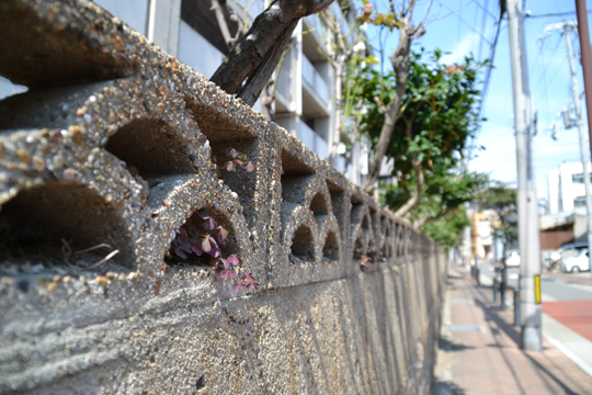 子ども通ってる専門学校の帰り。風雨にさらされてザラザラのコンクリートの影が真夏の日差しに長く伸びてる。